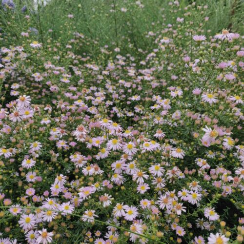 Aster ericoides ‘Pink Cloud’ is a graceful, late-season perennial producing clouds of tiny soft pink daisy flowers with warm golden centres. Flowering from early to mid-autumn, the countless blooms create a delicate haze of colour above fine, heath-like foliage.