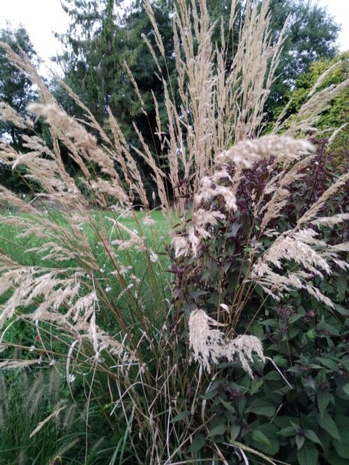 Very impressive, Quickly makes arching mounds of freshly striped green and white grassy leaves topped with feathery plumes in late summer. Fully hardy, Height 1.5 metre. Leave golden flowerheads over winter.