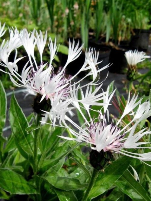 This refined Centaurea bears elegant white flowers with fine black stamens above fine grey-green foliage. Light, airy and long-flowering, it’s ideal for informal borders and pollinator-friendly planting.