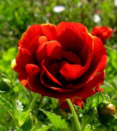 Potentilla ‘Gloire de Nancy’ Very large, semi-double, orange-red flowers with a splash of gold are borne in early summer to late summer, floriferous, with dark green leaves. Tough and doesn’t sprawl.