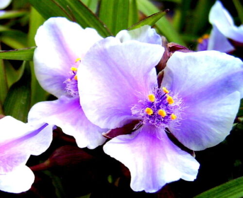 Tradescantia ‘Bilberry Ice’ is a graceful and free-flowering perennial producing soft lavender-blue flowers with delicate pale tones that give the plant its distinctive “frosted” appearance. The blooms open through late spring and summer, each lasting only a day but replaced continuously so the plant remains in flower for weeks.
